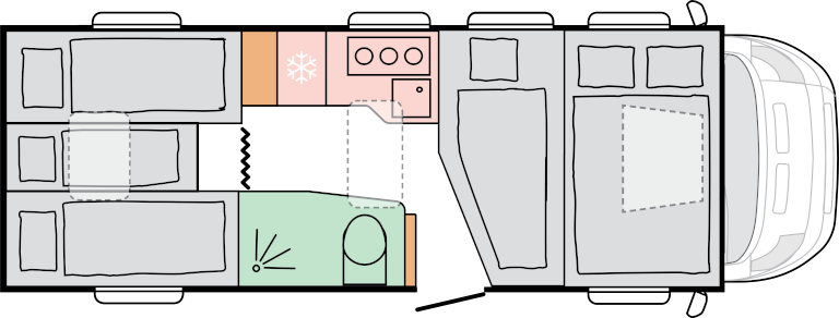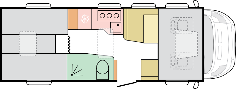 Notranjost avtodoma vas bo presenetila s prostornostjo in premišljeno uporabo prostora. Avtodom nudi odlične odlagalne in shranjevalne površine ter kuhinjo v kateri je vse pri roki. Udobna sedežna skupina zagotavlja dovolj prostora, na voljo pa so vam tudi udobna ležišča.