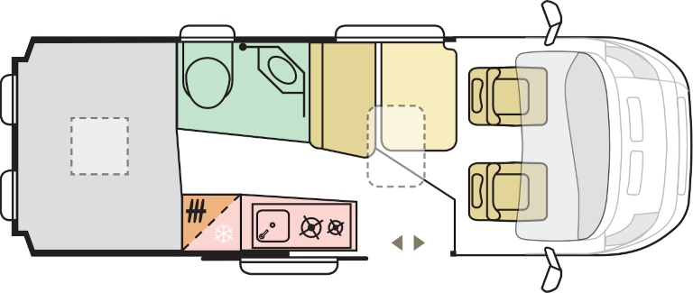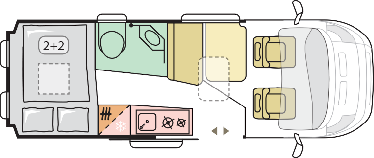 V zadnjem delu ima 2 udobni postelji, spodnja je namenjena staršem in zgornja otrokom. V avtodomu je lično opremljena in urejena kuhinja ter jedilna garnitura sestavljena iz sedežne klopi in dveh vrtljivih kabinskih sedežev. Kuhinja je praktično zasnovana in opremljena z 84-litrskim hladilnikom in plinskim kuhalnikom z dvema gorilnikoma. Vsa okna so opremljena s senčniki in komarniki.