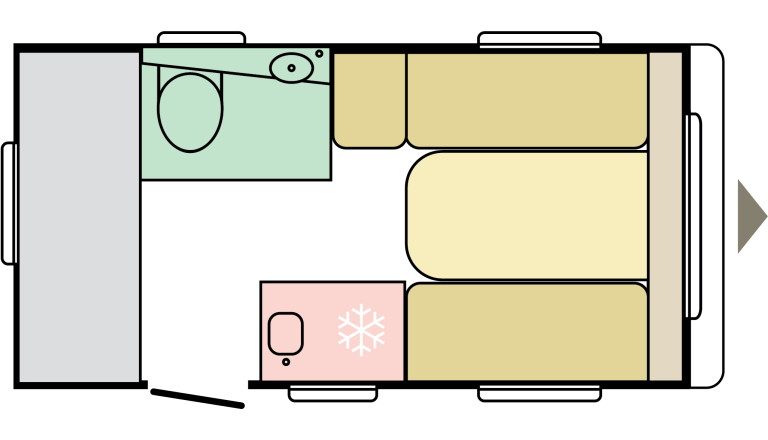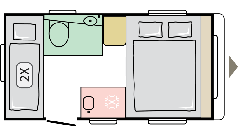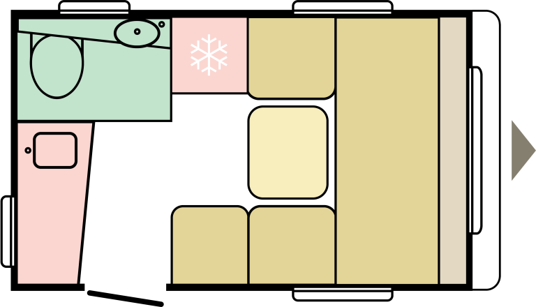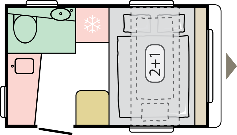 - Fiksno & prenosno: fiksni hladilnik, umivalnik in kopalnica ter stranišče. Prenosne omare, škatle za shranjevanje in miza.