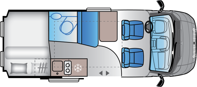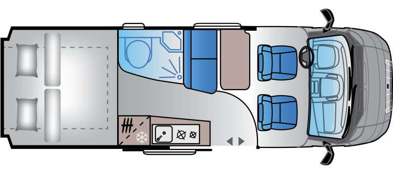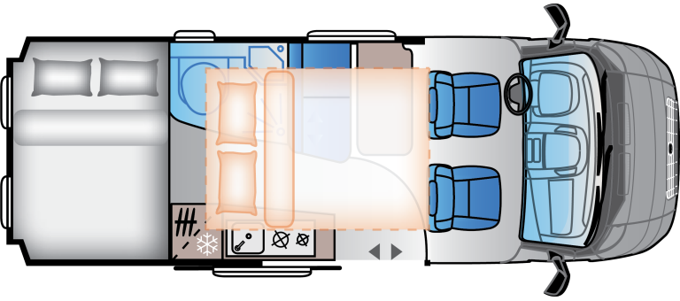 Uživajte v bivalnem prostoru, pripravljenem in zasnovanem za svobodno ter brezskrbno življenje na poti, kar omogočajo premišljene lastnosti, združene s pametno zasnovanimi in vašim potrebam prilagojenimi prostori. Uživajte v udobnem zatočišču notranjosti po dnevu, ki ste ga preživeli po vašem okusu, nato odprite vrata in vnesite v notranjost še čarobnost narave.