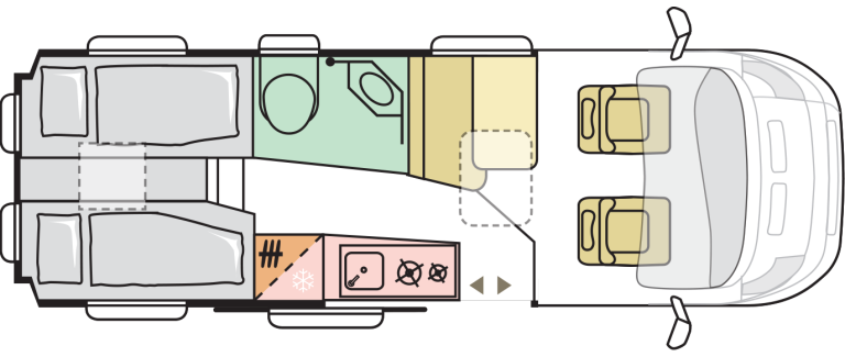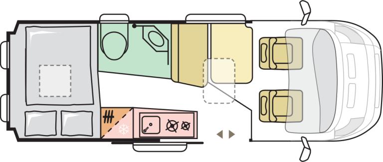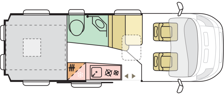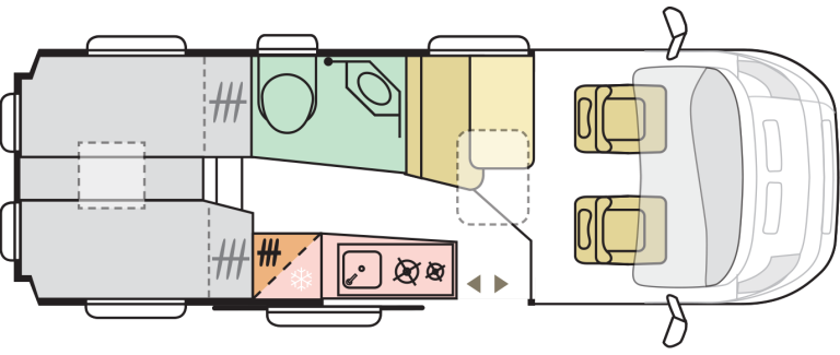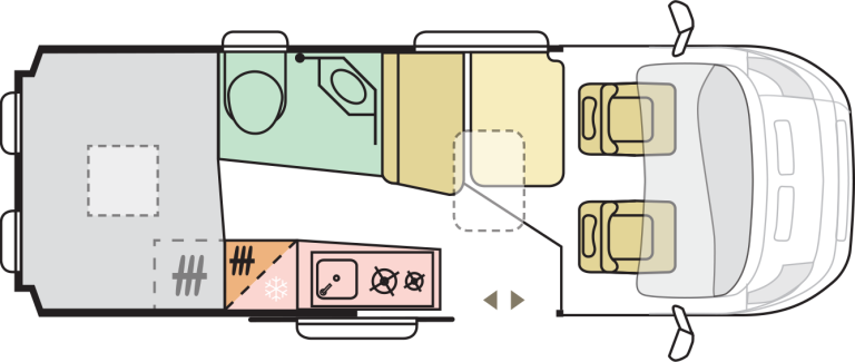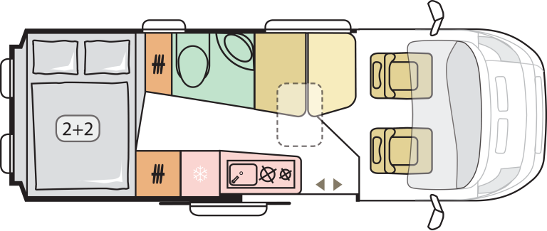 - Odprta notranjost z fiksnim panoramskim oknom nad kabino in Sky roof oknom nad bivalnim delom 90 x 60 cm standard