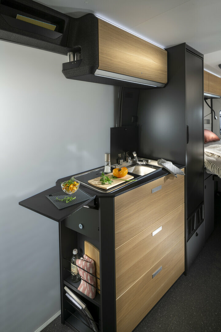 - Nova kuhinjska enota za več funkcionalnosti – dvoplamenski kuhalnik, korito in 3 veliki predali