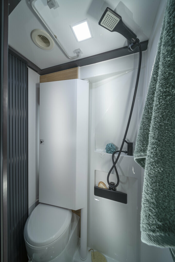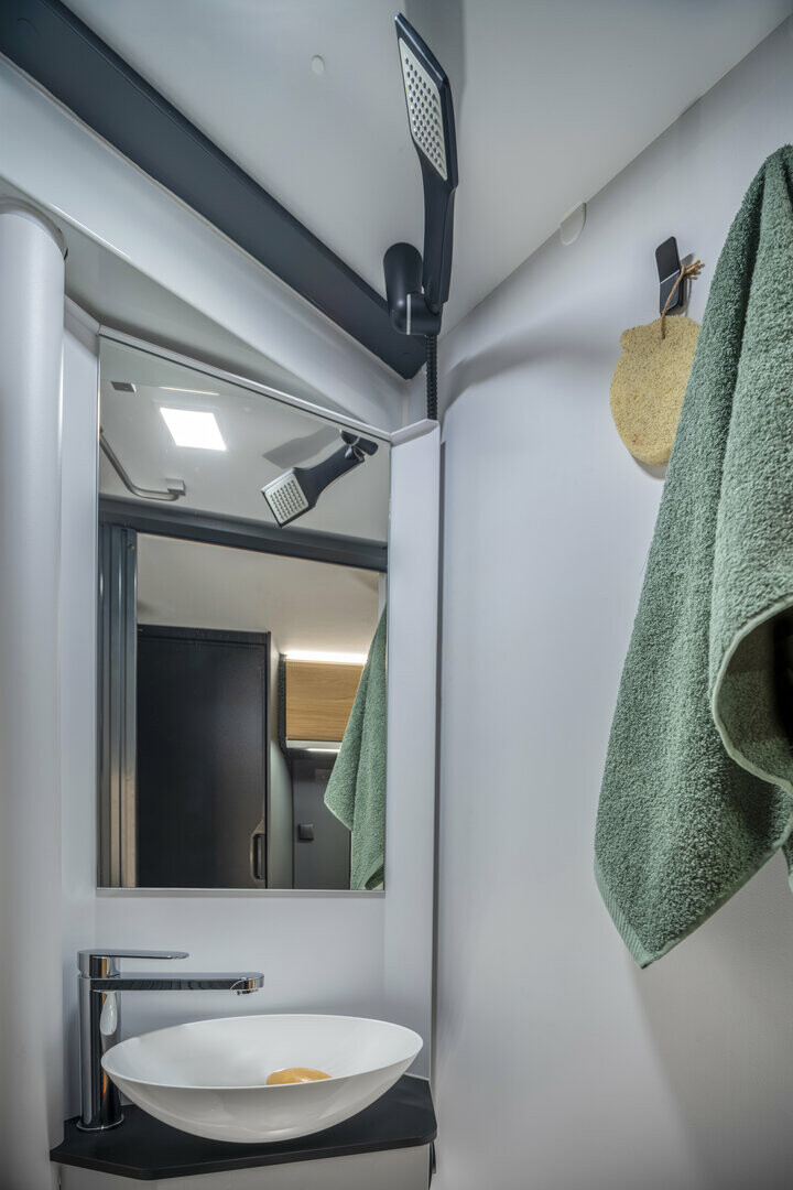 - Funkcionalna kopalnica s premično steno za prho, omarico za umivalnik in osvetljenim ogledalom